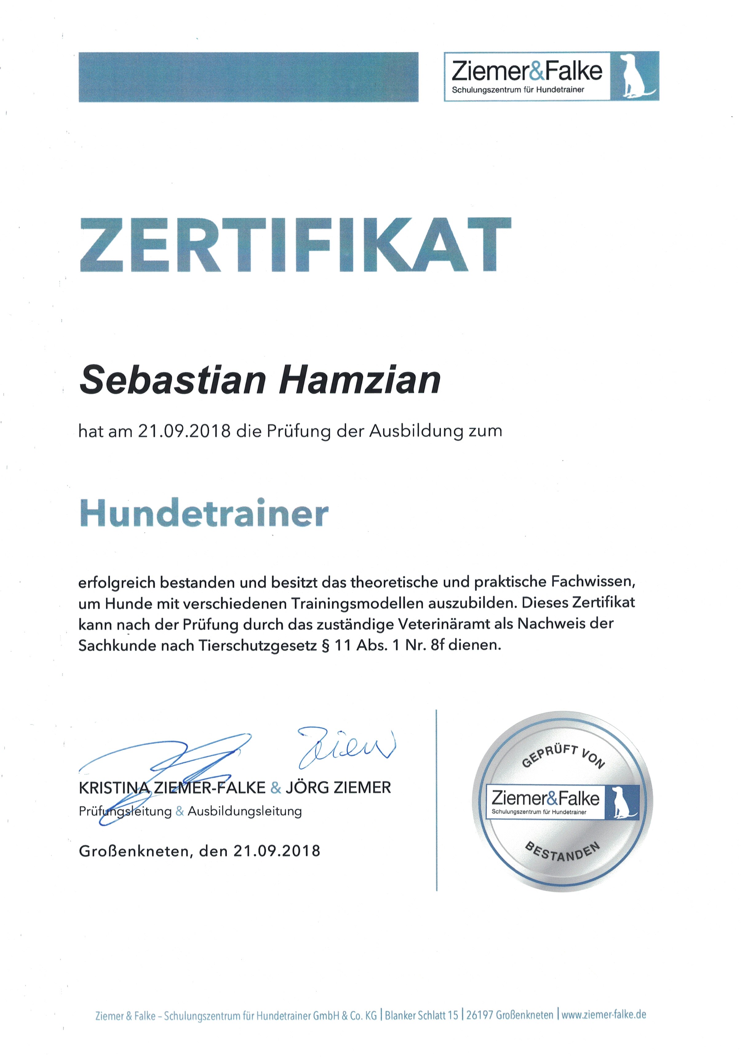 Hier findest Du eine kurze Übersicht über meine fachlichen Qualifikationen. In unregelmäßigen Abständen werde ich hier auch entsprechende Zertifikate hochladen und veröffentlichen. In folgenden Lerninhalten wurde ich erfolgreich ausgebildet und durch mehrere Institutionen geprüft. (zum Beispiel Ziemer & Falke, Veterinäramt Segeberg)